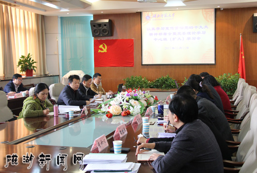 11月14日上午8:30,学校召开党委理论学习中心组(扩大)会议,集中学习党的十九大精神,部署安排党的十九大精神学习宣传贯彻和宣讲工作。校领导、党委理论学习中心组成员、各党总支(分党委)书记和有关部门负责人参加会议。校长、党委副书记李宏主持会议并讲话。