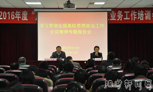 12月26日下午,学校在信息大楼报告厅举办学习贯彻全国高校思想政治工作会议精神专题报告会,省教育厅思想政治教育与社会科学研究处何泽云处长莅校作专题学习报告。校党委书记向显智、副yl23455永利官网与校机关党务部门的全体干部、马克思主义学院的全体教师、各学院分管学生工作负责同志、辅导员以及学生代表等参加会议,雷儒金主持会议。