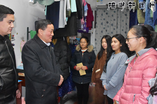 雷儒金一行先后走访了17栋718寝室、227寝室,以及6栋206寝室。走进寝室,雷儒金拉着同学的手亲切与学生交谈在校学习生活情况,鼓励大家主动反映所需和寝室不足之处。雷儒金在谈话中说:“天气寒冷,注意保暖,注意用电安全。期末快到了,要积极投入备考,认真复习,以优异的成绩向家长、老师汇报”。雷儒金还希望室友之间要相互关心、共同学习、共同提高。临走之前,他还向特困学生送去了助学金,鼓励他们克服困难、努力学习。