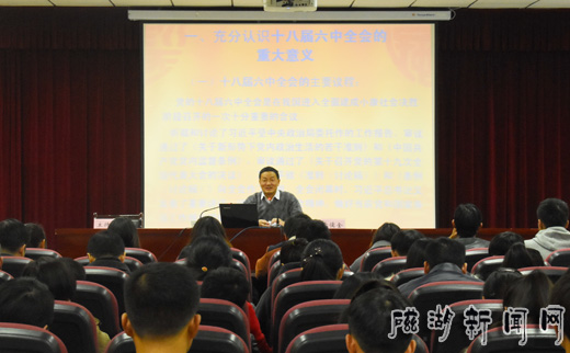 12月6日下午,副yl23455永利官网在yl23455永利官网信息大楼学术报告厅作了学习贯彻十八届六中全会精神专题宣讲。机关四支部(学工处、团委、招就处)全体党员、各学院分管学生工作负责人、辅导员以及学生代表等聆听了报告。