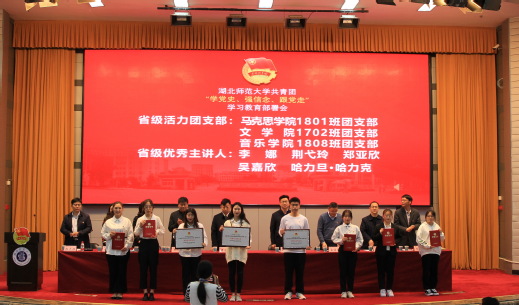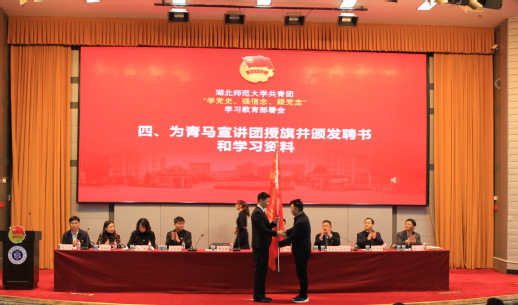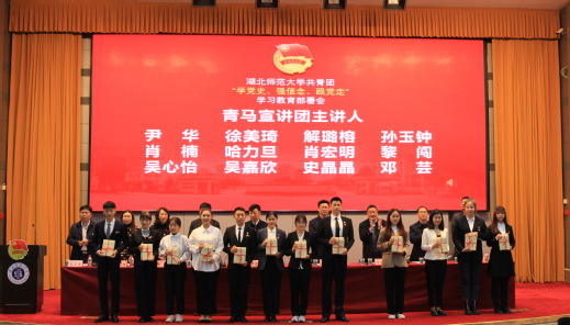 会上,团委负责人介绍了学校共青团以“七个一”为主要内容的党史学习教育实施方案。马列军宣读了成立湖师党史学习教育青马宣讲团的文件;与会领导为青马宣讲团指导老师和主讲人颁发聘书并发放学习资料,周启红为青马宣讲团授旗;主讲人代表孙玉钟宣读了党史学习倡议书。为鼓励各团支部结合活力团支部创建工作,提高党史学习教育质量,会上为3个省级活力团支部和5名省级优秀主讲人颁发了证书。
