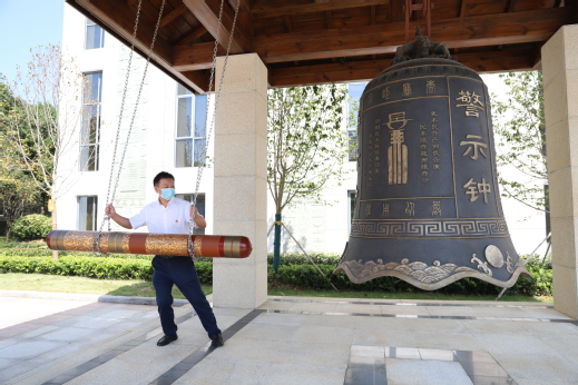 参观完展厅后,党委书记周启红敲响了门前的警示钟,浑厚的钟声回荡,寓意“反腐倡廉、警钟长鸣”,提醒大家要时刻筑牢思想防线,党风廉政建设永远在路上。在周启红领誓下,全体党员干部面对党旗,举起右拳,重温入党誓词。