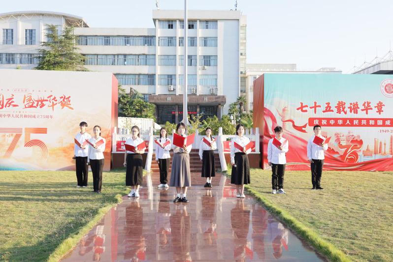 马克思主义学院鸿骐志愿服务宣讲团诗歌朗诵《献礼祖国华诞,谱写教育新章》,向全场青年学生发出倡议,青年一代生逢盛世,应与祖国同向同行,以青春之力量朝着强国建设、民族复兴宏伟目标奋勇前进。