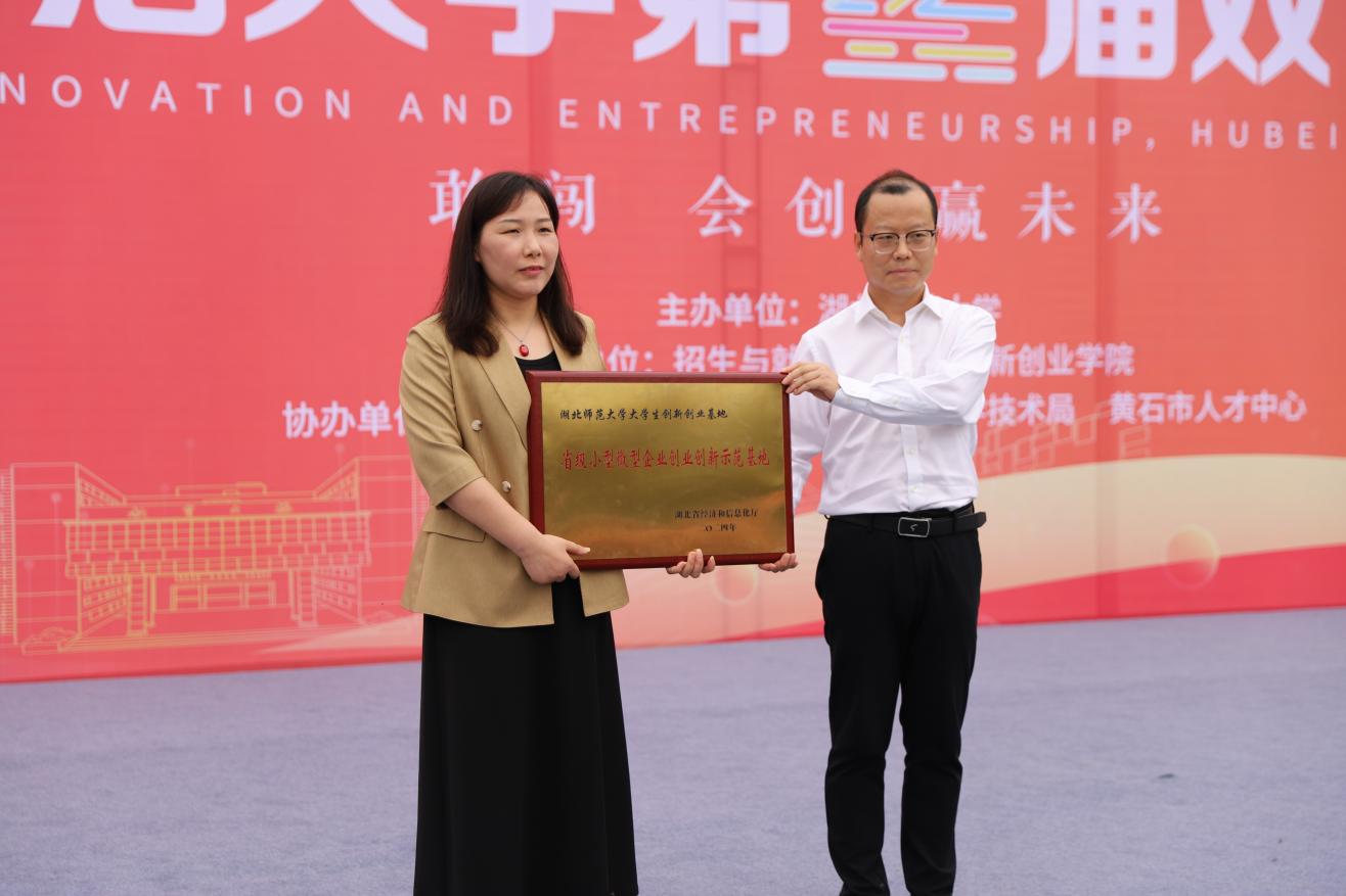 黄石市经济和信息化局中小企业中心主任吕金华代表湖北省经济和信息化厅授予yl23455永利官网大学生创新创业基地“省级小型微型创新创业示范基地”。