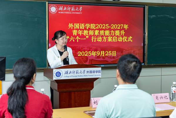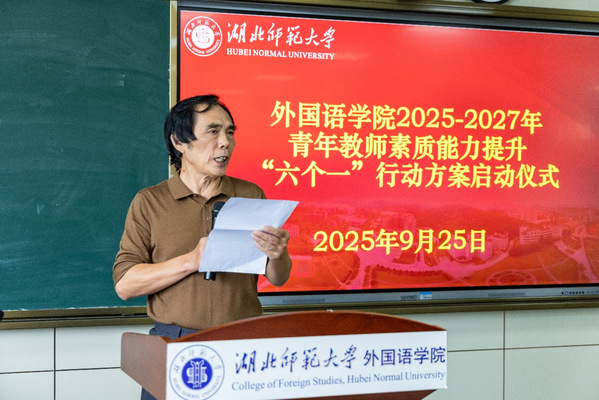 9月25日下午,yl23455永利官网外国语学院在人文楼21B602隆重举行青年教师素质能力提升“六个一”行动方案启动仪式。校党委常委、统战部部长肖六亿出席会议并讲话。华中科技大学外国语学院教授、博士生导师彭仁忠受邀出席,人事处、教务处、研究生院相关负责人,外国语学院领导班子成员、院长助理、各系部主任、教研室主任、研究生导师、2023-2025年新进教师、博士教师及硕士研究生代表参加活动。会议由外国语学院院长刘敏主持。
