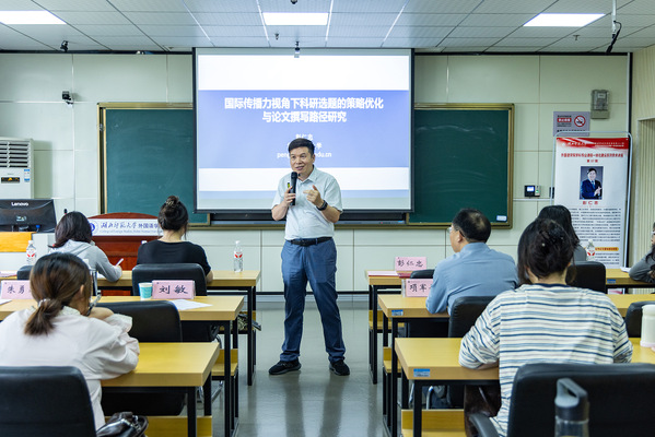 启动仪式后,彭仁忠教授以“国际传播力视角下科研选题的策略优化与论文撰写”为题授课,结合实例讲解选题策略与论文撰写要点,解答师生疑问。