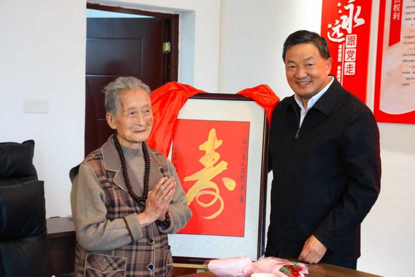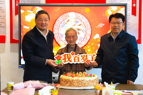 在温馨的生日歌声中,李宏和雷儒金共同为寿星们分送生日蛋糕,表达美好祝愿。期间雷儒金为百岁老人罗俊送上“寿”字贴,将现场气氛推向高潮。