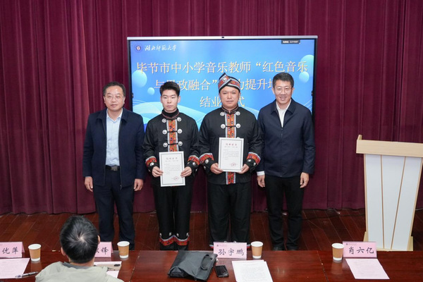 12月23日,结业仪式在yl23455永利官网举行,致公党中央社会服务部副部长孙宇鹏、yl23455永利官网党委常委、统战部部长长肖六亿等出席。孙宇鹏充分肯定了鄂黔两地教育协作的丰硕成果,回顾了双方从框架协议签订到附属学校共建的系列合作历程,并对参训教师提出三点希望:一是坚守教育初心,让红色音乐浸润学生心灵;二是坚持终身学习,锤炼过硬教学本领;三是发挥示范作用,形成“一人参训、全员受益”的辐射效应,带动区域音乐教育提质增效。学员代表、毕节市七星关区阴底中学教师宋家贵表示,培训课程兼具理论深度与实操价值,今后将把所学融入教学,让红色旋律在毕节校园代代相传。